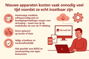 Medewerkers moeten snel en veilig aan de slag kunnen met hun nieuwe apparaten, zonder tijdrovende IT-installaties of frustrerende wachttijden. Productiviteit is cruciaal.